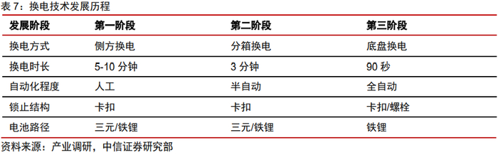5)技术:经过长期发展,通过关键环节的迭代更新,换电技术在换电时长、兼容性及自动化程度上都有了长足进步。