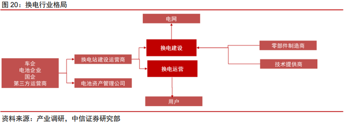换电运营商:具备行业资源整合能力的第三方运营商有望胜出。换电运营商是换电产业链的核心环节,通过选址、建站、对接下游G端、B端、C端各种社会关系和资源方来提供换电服务,综合能力要求最高:
