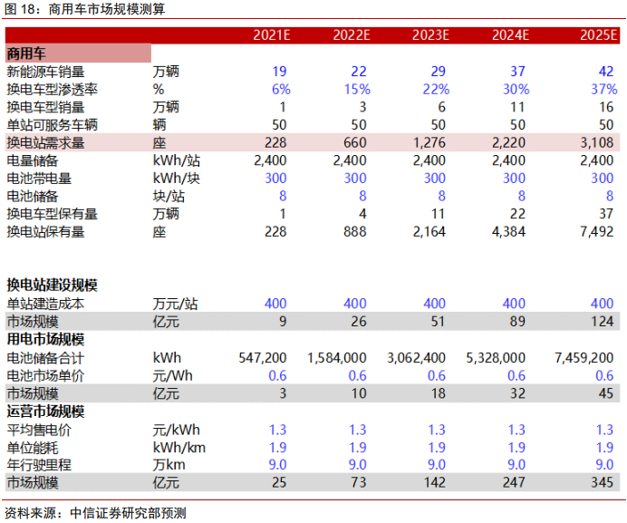 设备端按照乘用车250万、商用车400万的单站设备投资规模进行测算;运营端按照1.6元/度,乘用车单块电池带电量50度,商用车单块电池带电量300度进行测算。我们预测2022年换电站设备市场规模为94亿元,用电市场规模约32亿元,运营市场规模约145亿元。
