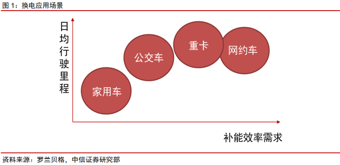 新能源换电应用场景丰富、续航里程长、补能效率高。无论C端私家车、B端出租车或短途重卡,均可以作为换电的应用场景,并且大多场景已经开始逐步落地,能够有效解决商用车行驶者的里程焦虑、补能效率要求高等问题。