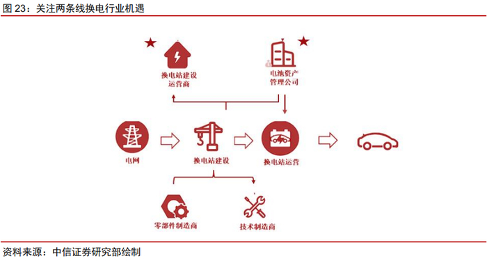 中游主要为换电站建设和运营商,负责换电站的搭建和运营,面向市场提供换电服务,对口B端相对C端更多;换电站的建设运营对资金需求量较大,对电池的投资、车位选址、布线改造和运营管理都有很强的要求,电池资产公司将由此成立,并与动力电池企业、融资租赁公司等形成合作,减轻资金压力。