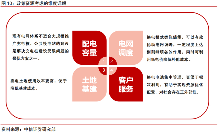 从政府政策和社会资源配置的角度考虑,在新能源汽车的未来发展中,换电模式的大规模应用将是大势所趋。相较于充电模式,换电模式在配电容量、电网调度、土地资源、基础建设、电池管理等方面起到更好的调节作用。
