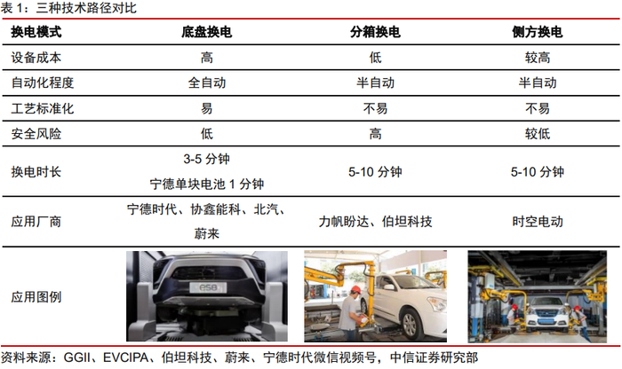现有换电方式主要为:底盘换电、侧方换电及分箱换电,底盘换电为主流。底盘换电不改变车体前后轴重量,有利于保障汽车安全性及运行特性,换电全自动、时长短,较多箱非底盘换电更具便利性与安全性,目前约80%的车型采取底盘换电。但需注意,底盘换电虽是主流换电方式,但仍具有需改变底盘结构、封装工艺复杂等痛点。