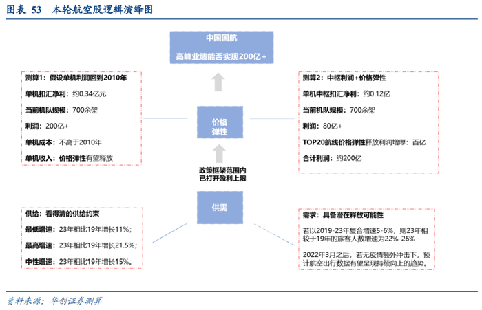 价格弹性贡献测算:若考虑此前报告测算当国航TOP20航线折扣率均达到80%状态下,增厚利润亦超过百亿,加上其他航线的或有增量贡献,同样将有机会冲击200亿利润体量。
