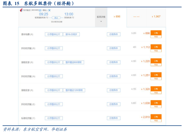以东方航空上海虹桥-成都双流机场的航线为例,仅经济舱就包含青年特惠、折扣经济舱、里程优惠和标准经济舱多款产品。