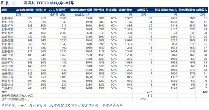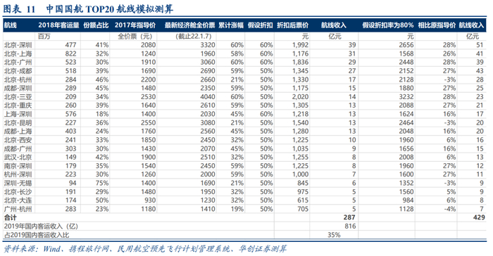在2018年客运量基础、折扣率50-60%情形下,合计收入达到287亿,相当于国航2019年国内客运收入的35%,若提价10%,对应可增加29亿收入,对应超过20亿利润;