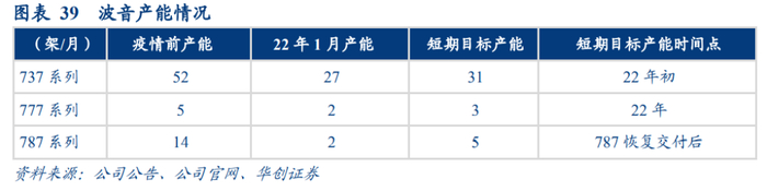 787梦想飞机目前月产量为2架,远低于2019年14架的水平。主要因潜在技术问题,787暂停交付,产能主动下调,公司预计在恢复交付后产能逐步提至5架。