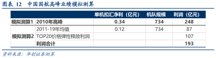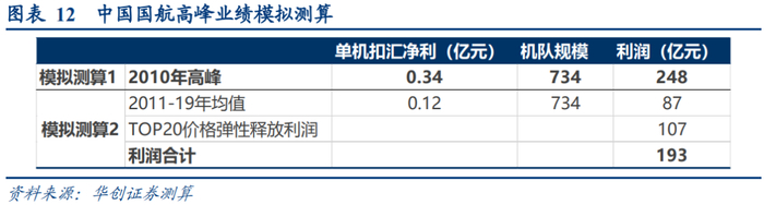 b)价格弹性贡献测算:我们测算当国航TOP20航线折扣率均达到80%状态下,增厚利润亦超过百亿,加上其他航线的或有增量贡献,同样将有机会冲击200亿利润体量。
