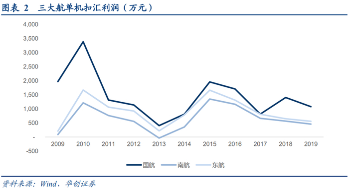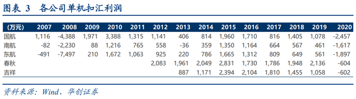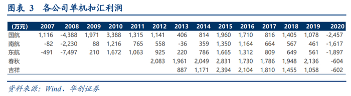 统计2009年以来,以国航为例,单机扣汇利润高点为2010年的3388万元,其次为2009、2015年均达到2000万左右,而2011-19年平均单机利润为1200万左右。