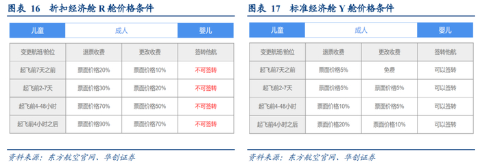 不同的舱位价格对应不同的条件,其中折扣经济舱R舱,起飞前7天以前、2-7天、起飞前4-48小时、起飞前4小时之后的退票费率分别为票面价格的20%、30%、70%和90%;更改的费率分别为10%、20%、50%和70%,不得签转他航。而标准经济舱Y舱的退票费率分别为5%、5%、10%和20%,更改费率分别为0%、5%、5%和10%,且可签转他航。显然,标准经济舱Y舱机票的灵活性明显高于折扣经济舱,票价也更高。