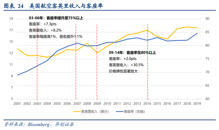 2)价格弹性的程度最终是供需决定的。我们回顾了美国航空业03年以来以及我国航空业09-10年的表现,发现供需推高客座率时,票价水平对应提升。