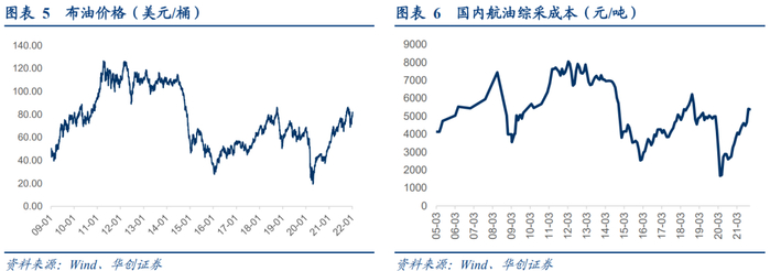 回顾2010年,平均油价为80元/桶,国内航油综采成本平均为5700元/吨,21年末布油价格与2010年接近,综采成本5400元/吨,略低于当年,2022年1月以来油价冲高,预计2022-23年整体航油价格水平或与2010年较为接近。同时燃油附加费的调节机制可以帮助航空公司一定程度转嫁成本上涨。