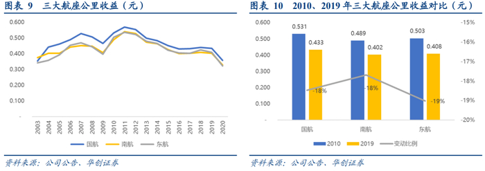 航空公司座公里收益水平在2011年见顶后,整体呈下降趋势。对比三大航2010年与2019年收益水平,座公里收益平均降幅18%左右(或0.1元)