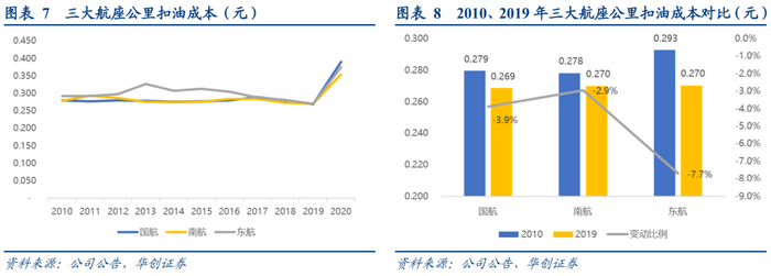 2019年三大航平均座公里成本0.270元,较2010年的0.283元下降约5%。