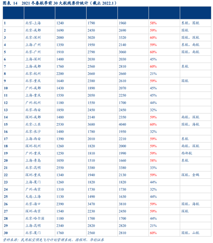 注:截至1月,国航2021年冬春航季的Top20航线中,有9条航线已提价5次,较原指导价提高近60%;有3条提价4次,平均涨幅45%左右;4条提价3次,4条提价2次。累计提价超过30%的航线占比80%。