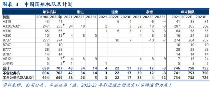 飞机退出方面,假设22-23年退出机队回到此前正常水平即为引进的20%左右,则22-23年分别退出69和74架。