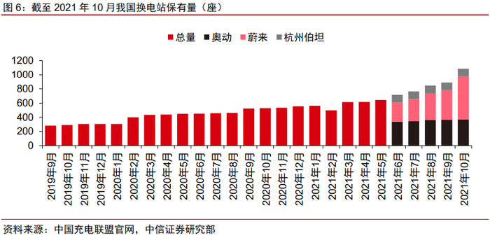 截至2021年10月,我国共计换电站保有量达 1086 座,2021年初为562座,近十个月累计增长93.24%,预计2021年底约1300座。根据中国充电联盟的数据,目前我国换电站市场主要是三家企业——奥动、蔚来、杭州伯坦。截至2021年10月,奥动换电站保有量占比34.07%,蔚来占比 56.08%,杭州伯坦占比 9.85%。