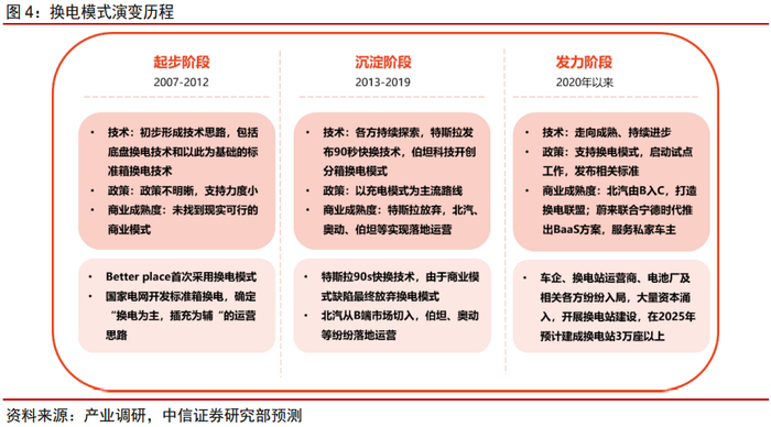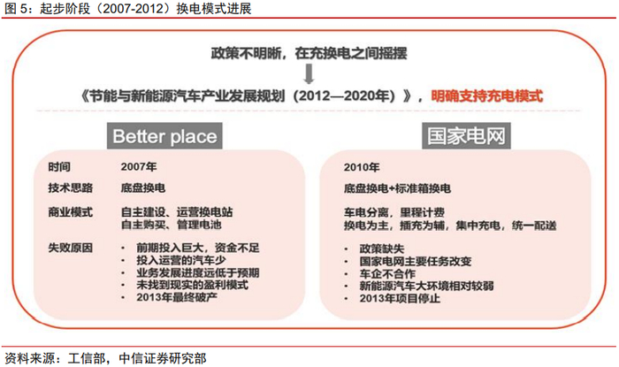 2007~2012是换电模式的起步阶段,初步形成了底盘换电的技术思路,但整体行业发展不及预期,主要是由于没有形成现实可行的商业模式,以及政策不清晰、市场环境不配套等不利因素。2013年,首家乘用车换电公司Better Place最终破产,国家电网的换电项目也最终停止。