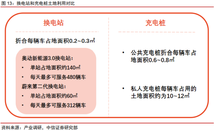 换电土地使用效率更高,便于降低基建成本。换电站如同加油站,除排队时间外,车辆开入后基本不会额外花费时间停留。而充电站需要为每个桩位预留较大的土地面积,且车辆对车位的占用时长难以控制。根据我们测算,私人和公共充电桩的占地面积都明显高于换电模式。由此,换电站对于城市特别是大城市的土地集约利用具有明显帮助。