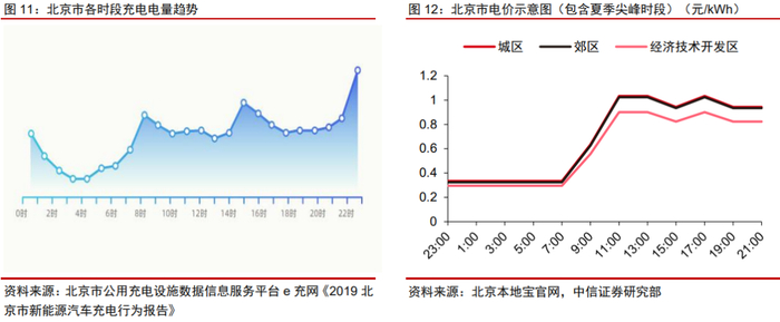 换电模式类似储能,可以有效协助电网调峰。一般而言,下班后的晚间是新能源汽车充电高峰期,以北京市为例,公共充电设施的充电高峰时段分别为早8:00、下午16:00、晚23:00。而北京市夏季11时-23时电价居高,度电价明显高于23时-7时。在换电模式下,换电站可充分利用夜间23时-7时的低谷电价对电池进行充电,一定程度上达到削峰填谷的作用,同时可利用低电价降低补能成本。
