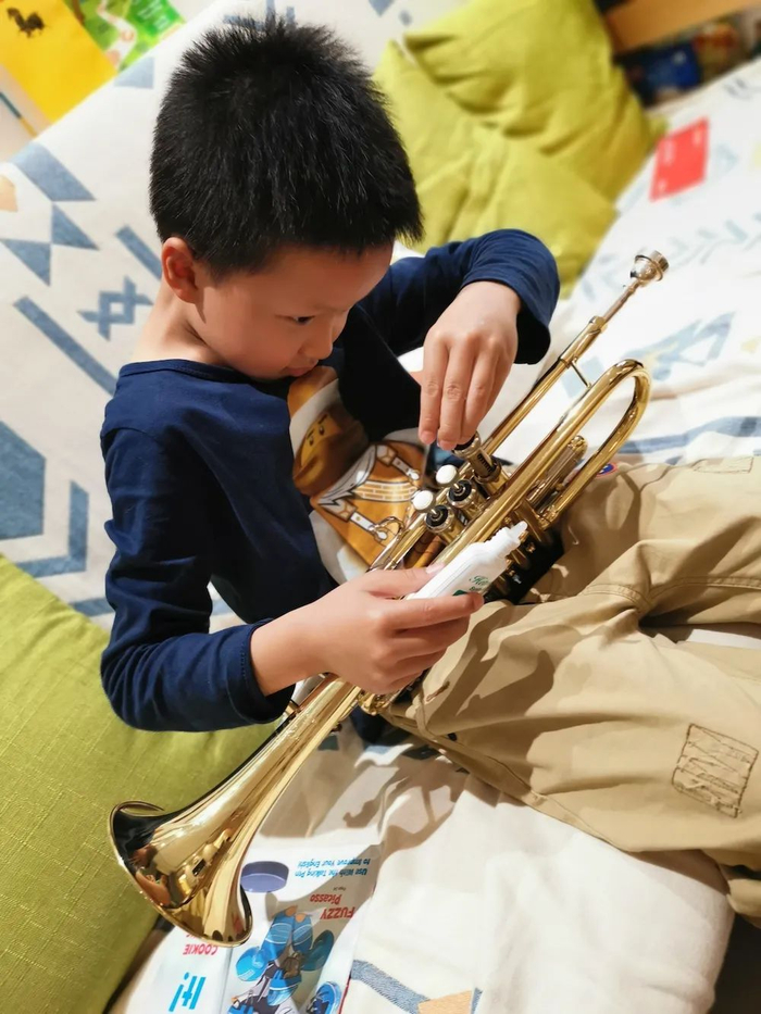 从临时拿到《我和我的祖国》曲谱,到熟悉曲子、录成视频发给奥组委,朱德恩只有三个小时的时间。“我们确实没抱什么希望,孩子终究还是太小了,学的时间也短。”张雅楠说。2020年3月,在朱光生日那天,朱德恩正式“拜师”,跟着爸爸学吹号。“对他来说,小号就像玩具一样。”张雅楠觉得,孩子对小号的兴趣也许真的得益于天赋和家庭潜移默化的影响,“在他出生前,我们给他准备了一些小玩具,其中就有把彩色的小号。爸爸没事要在家里练,也会上课教学,恩恩小时候就会很好奇,为什么爸爸总把号嘴放在嘴里,小号又是怎么发出声音的呢?他会用小手指学着去按键。”正说到这里时,朱德恩接过妈妈的话,补充了一句:“就是觉得好玩。”在他的成长中,小号一直有着不一样的意义。朱德恩的爷爷朱尧洲是新中国第一代小号演奏家,老人家今年85岁了,虽然耳朵不像从前那么好,但永远是“恩恩心目中除了爸爸以外的一号英雄”。
