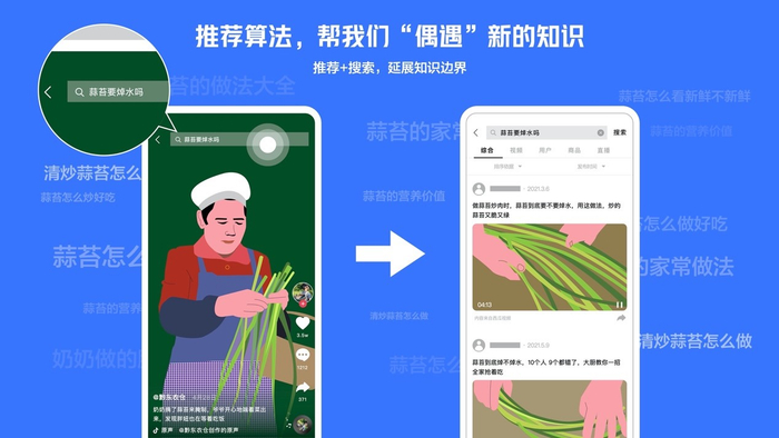 贵州返乡创业青年丁浪用抖音号@黔东农仓 记录腌蒜苔制作过程。在推荐系统的帮助下:1)视频能被准确推荐给对乡村美食、农特产品感兴趣的用户;2)用户能顺势在同屏搜索框中搜索、了解蒜苔烹饪相关内容,扩展相关知识。
