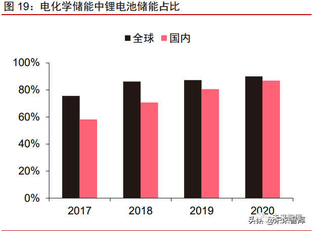 电化学储能装机高速发展,锂电池占比近 90%。2016-2020 年电化学储能迎来高速发 展,全球装机由 1.8GW 提升至 13.1GW,CAGR 高达 64.93%;国内装机由 0.2GW 提升 至 2.8GW,CAGR 高达 84.37%。在近几年的新增装机中,电化学储能装机占比稳固,其 高速发展的趋势仍在延续。电化学储能中,又以锂电池储能占比最高。2017-2020 年,全 球/国内电化学储能中锂电池占比分别由 75.6%/58.3%提升至 90.0%/87%,进一步稳固了 电化学储能电池中的领先技术地位。
