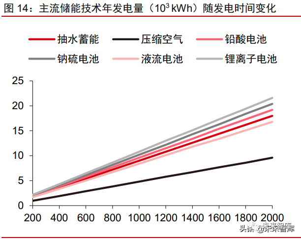 抽水蓄能享有成本优势,锂电池储能和压缩空气储能紧随其后。随发电时间的延长, 单位度电成本会显著下降,这使得厂商通常不会采用复合的储能技术。抽水蓄能最为大规 模应用的原因之一即为其成本优势,在主流储能技术中,抽水蓄能成本最低。成本接近抽 水蓄能的有压缩空气储能和锂离子电池储能,在发电规模足够大时,这两种技术成本能贴 合抽水蓄能。其余主流技术成本,无论在小规模储能还是大规模储能,与此三者均有较大 差异,他们的成本由低到高依次是液流电池、钠硫电池和铅酸电池,均属于市场占有相对 较小的电化学储能形式。