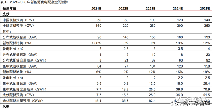 根据我们对 2021-2025 年全球光伏(分布式、集中式)、风电的新增装机规模预测, 在相应配储功率比例和储能渗透率假设下,我们预计 2021-2025 年,光伏发电装机的配 套 储 能 需 求 为 7.7/15.5/25.0/36.0/51.5GW , 相 应 备 电 时 长 假 设 下 的 容 量 预 测 为15.4/35.3/62.4/102.6/163.6GWh;相应风电装机预测下,我们预计 2021-2025 年风电发 电带来的配套储能需求为 1.7/3.6/6.1/9.2/13.0GW,相应备电时长假设下的容量预测为 3.5/7.3/12.2/20.2/32.5GWh。