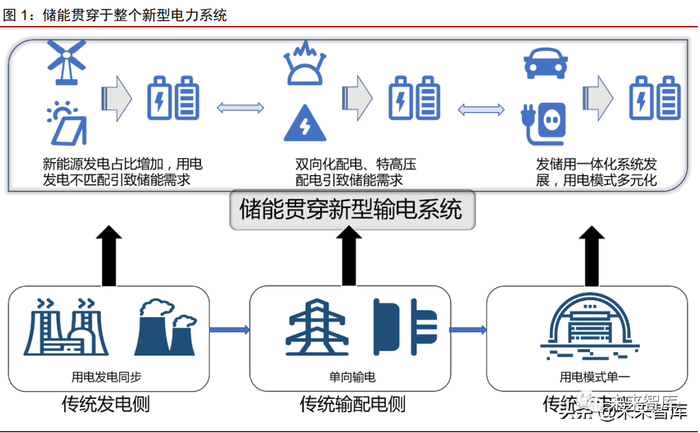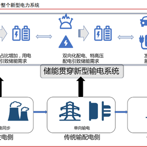电力系统转型在即,储能行业迎来发展。碳中和目标的实现需要风电、光伏等新能源 大规模的建设,而新能源发电具有不稳定性、间歇性的问题,提高了电网在输配容量、电 频波动控制等方面的要求,有效的运营需要新型电力系统的支持,新型电力系统正在经历 从“源-网-荷”到“源-网-荷-储”的变化,储能有望成为新型电力系统的第四大基本要素。新型电力系统在用电侧,将由同步发电机转变为光伏、风电等可再生能源为主;在输配电 侧,由单向送电转变为特高压直流、双向输配电系统;在用电侧,由单一用电转变为复合 多层次用电。而储能设备贯穿于新型电力系统转型的发电、输配电、用电三个环节,将迎 来快速发展的机遇。