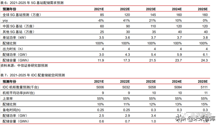 我们预计 2021-2025 年,伴随我国及全球 5G 基站的大规模建设周期逐步落地,有望 带动配套储能需求的装机规模为 3.0/4.3/5.4/5.9/6.1GW,对应备电时长下的配储容量为11.9/17.3/21.5/23.7/24.3GWh。相应的,根据 IDC 的建设预期,我们预计 2021-2025 年 IDC 数据中心建设有望带来年均约 2.5-5GW 的储能建设需求,需求较为平稳。综合来看,预计 2021-2025 年我国储能建设需求 2.5/2.9/3.4/3.8/4.7GW ,对应储能容量需求 0.6/0.7/1.0/1.1/1.4GWh。