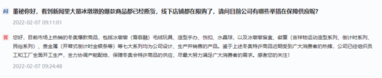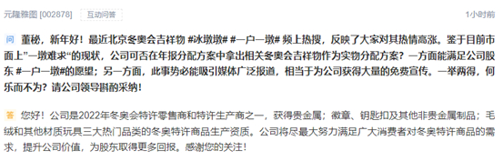 2月7日,还有投资者在互动平台提出,“公司可否在年报分配方案中拿出相关冬奥会吉祥物作为实物分配方案?一方面能满足公司股东‘一户一墩’的愿望;另一方面,此事势必能吸引媒体广泛报道,相当于为公司获得大量的免费宣传。”