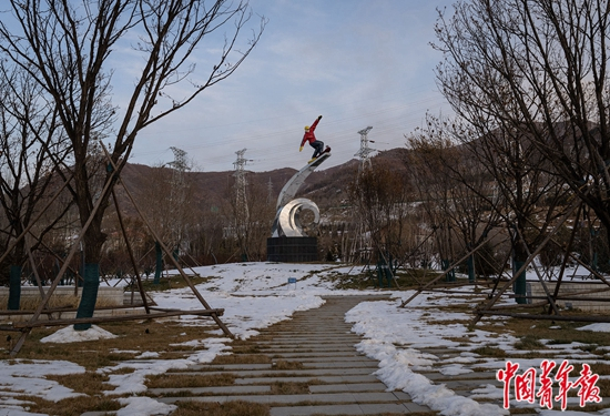 2021年11月19日,河北张家口崇礼,街头的滑雪者雕塑。中青报·中青网记者 李峥苨/摄