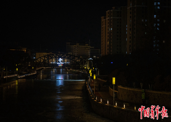 2021年11月20日晚,河北张家口崇礼,桥上亮起2022年冬奥标志灯,桥边的一处建于2015年的楼盘均价超过2万元每平方米。中青报·中青网记者 李峥苨/摄