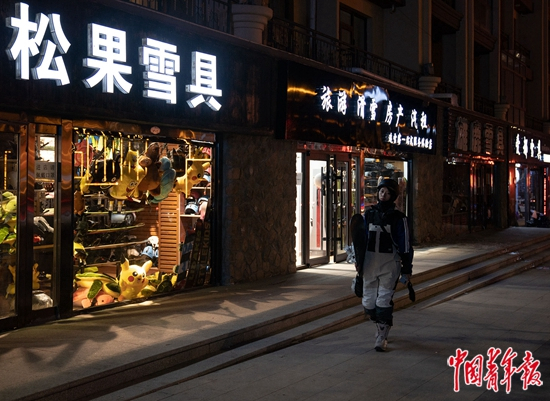 2021年11月20日晚,河北张家口崇礼,一名滑雪者全副武装,走过一整条街的雪具店。中青报·中青网记者 李峥苨/摄