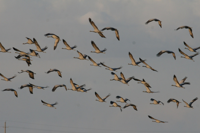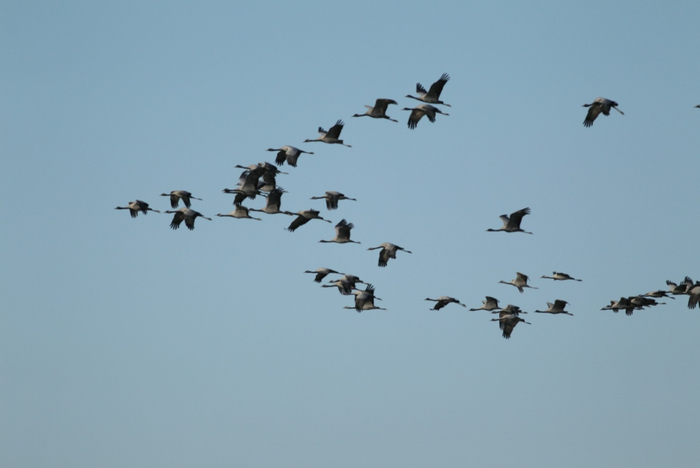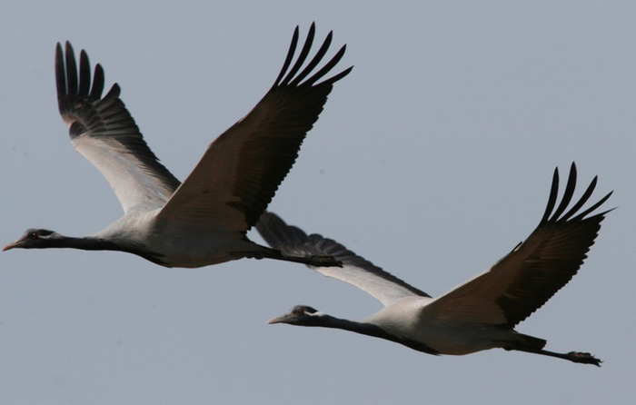 每年9月,蓑羽鹤早于天鹅等水禽开始南迁。原先单个鹤群家族不足10只,在短短的10天里就会迅速扩大到几百上千只。为了节省体力,鹤群在头鹤的带领下,靠上升的气流帮助自己飞得更高。飞在最前面的总是队伍中最强壮的,因为这个位置遇到的气流和飞行阻力都非常大。它们的队形排成“一”字或“人”字形迂回攀高,这样可以最大限度地减少空气阻力。