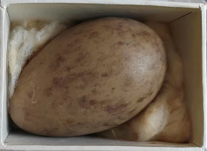 蓑羽鹤的卵标本,比鹅卵还大些,布满了赭褐斑,与地面(窝)的颜色近似,可以有效地避开天敌偷食。