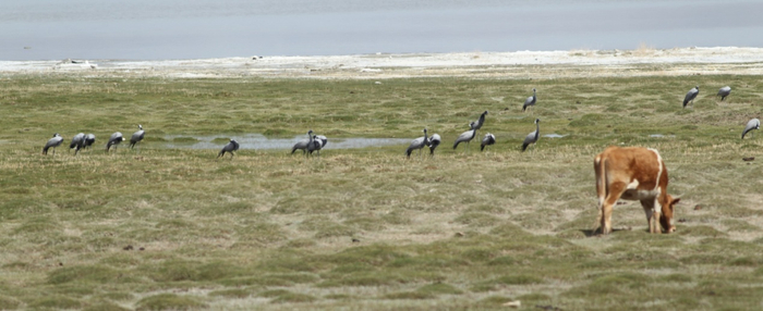 在开阔的巴里坤湖边的草地上,蓑羽鹤开始集群准备迁徙