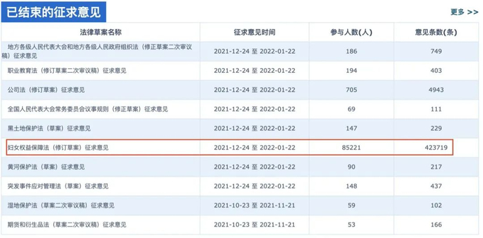 2021年12月24日到2022年1月22日,《中华人民共和国妇女权益保障法(修订草案)》面向社会公开征集意见。这是自1992年立法通过以后,《妇女权益保障法》的第三次修订。截至1月22日,本草案意见征集在中国人大网上共有85221人次参与,意见数达423719条,在同时期征集意见的法律修订草案中遥遥领先。