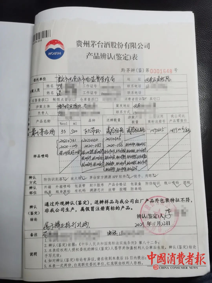 随后用专业设备鉴别,确定这25瓶茅台酒都是以假乱真、以次充好的“打孔”酒,最终出具的鉴定结论为:“通过外观辨认(鉴定),送辨样品与我公司出厂产品外包装特征不符,非我公司生产,属假冒注册商标的产品。属于揭正标打孔酒”。