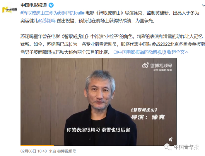 苏翊鸣的精彩表现被网友称为“横跨CCTV6和CCTV5的男子”,因为在运动员身份之余,他还是一名演员,在徐克执导的电影《智取威虎山》中,“小栓子”的扮演者正是10岁的苏翊鸣。他同时还参演过《狼殿下》《林海雪原》《摇滚小子》等影视作品。