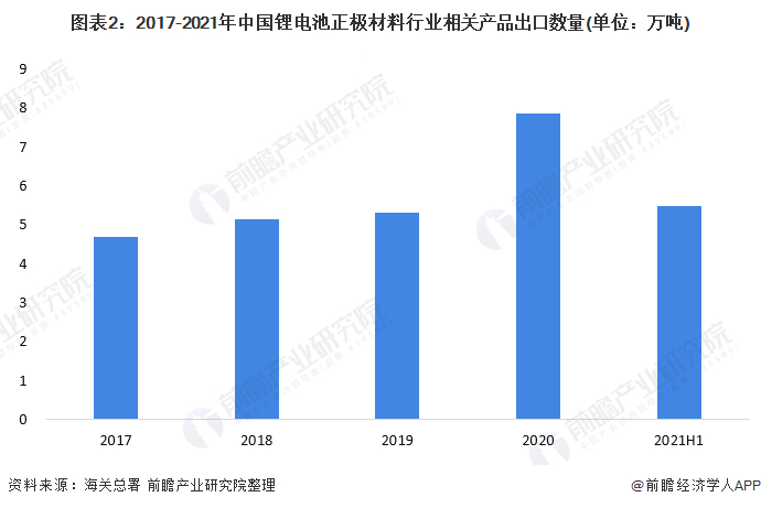 2021年上半年,我国锂电池正极材料的出口数量达到5.48万吨的较高水平,2021年全年预计还将保持增长态势。