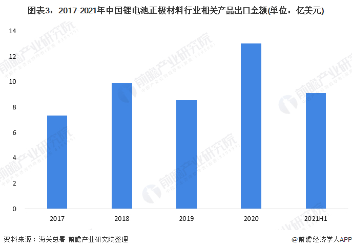 2021年上半年,我国锂电池正极材料的出口总额达到9.10亿美元的较高水平,2021年全年预计还将保持增长态势。