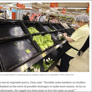 香港一位雷姓菜贩表示,不少顾客抱怨蔬菜价格很贵,并减少了购买量。雷某称,因为蔬菜供给无法进入香港,零售商们也无能为力。此外,在铜锣湾等地的超市中,晚间货柜上的蔬菜也已经被抢购一空。