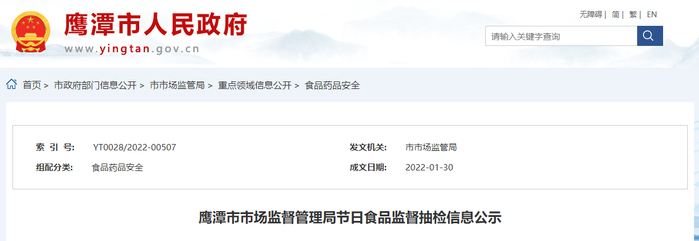 江西省鹰潭市市场监管局公示节日食品监督抽检信息