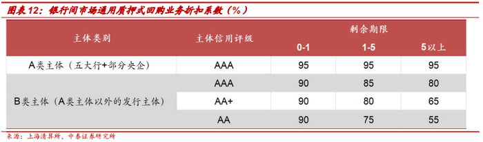 银行间市场通用质押式回购业务的推出,一定程度上可视作对交易所市场强大交易系统的借鉴。目前来看,相较于交易所市场,银行间市场通用质押式回购业务准入门槛更低、质押券范围更广、分类更加精细。此外,上清所采用《债券交易净额清算业务与通用质押式回购业务质押券管理规程》[20]确定质押券的折算率,折扣系数整体也要高于交易所市场。