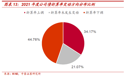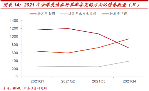 从整体变动方向来看,2021年间,公司债的折算率以下调为主。样本债券中,折算率上调的有704只,占研究样本的34.17%;折算率未发生变动的有434只,占研究样本的21.07%;折算率下调的有922只,占研究样本的44.76%。分季度看:在2021年四季度,公司债折算率下调只数明显上扬,上调只数仅占比1/3。
