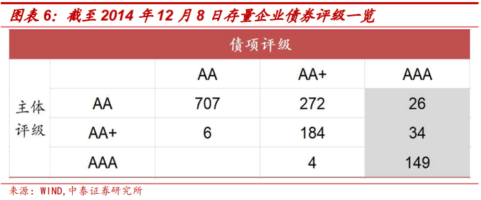 2014年12月,中登公司提出暂不受理新增企业债券回购资格申请。此次调整对合格质押品范围(主要是企业债券)造成了巨大影响,但公司债券不受影响。中登公司发布《关于加强企业债券回购风险管理相关措施的通知》[11],暂时不受理新增企业债券回购资格申请,已取得回购资格的企业债券暂不得新增入库,其中按主体评级“孰低原则”认定的债项评级为 AAA 级、主体评级为 AA 级(含)以上(主体评级为 AA 级的,其评级展望应当为正面或稳定)的企业债券除外。这一新规使企业债质押资格门槛大幅提高,大批量不符合条件的企业债老券因此失去质押资格,对企业债市场流动性造成了巨大冲击,部分城投债因此下跌明显。如下图所示,截至2014年12月8日,存量企业债券中符合债项评级为 AAA 级、主体评级为 AA 级(含)以上要求的债券数量仅为209只。