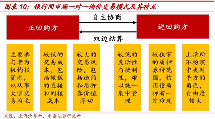 相对于交易所市场,银行间市场的通用质押式回购业务起步较晚。在2019年8月22日之前,银行间市场的质押式回购业务的主要交易模式为一对一询价模式。各机构都需自行寻找交易对手方,这使得该业务便利性不足,交易成本较高,且有较大的交易对手风险。
