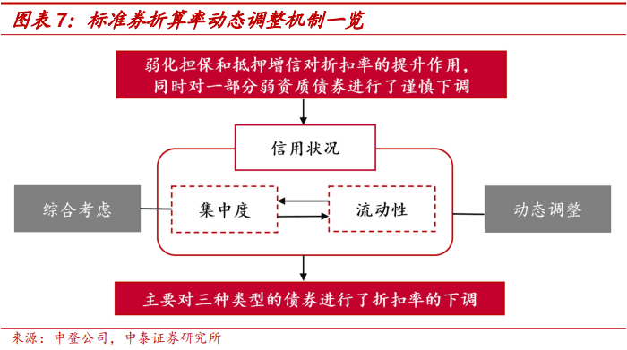 完善风险管理体系,增加入库债券质押率调整主动权,降低对外部评级的依赖。近十年来,中登公司一直在增加入库债券质押率调整的主动权,这是中登公司在提高债券入库门槛,标准化折扣系数取值标准以外的风险管理补充机制。2013年12月,中登公司发布折扣系数取值业务指引时,就已经规定了入库债券在外部评级未发生改变的情形下,信用债折扣系数可能发生下调的三条原因[1];2015年11月,中登公司提出引入标准券折算率的动态调整与管理机制;2016年7月,中登公司进一步完善根据风险状况进行债券折扣系数灵活调整的机制,并规定了中登公司可以对标准券折算率进行主动调整的几类情形;2017年4月,中登公司再次完善了对回购质押品进行主动管理和动态调整的规则依据。